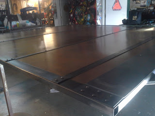 I've been working on two large steel doors (9'2" h x 8'6" w) for a local retail store in Bend, Oregon. It's been quite a project. I've learned a lot about welding light tubing and sheet; before this project I'd never even purchased 22 gauge steel sheet before, much less welded it. I also have never tried to patina such a large expanse - challenging operation! Doors are mostly complete at this point - still working on building the custom rollers and track hardware and then have to install everything. Doors weigh approximately 475 pounds so moving them is tough.